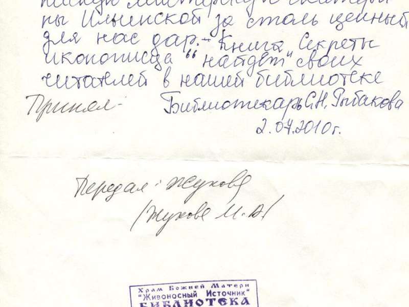Библиотека православного центра при храме «Живоносный источник» благодарит иконописную мастерскую Екатерины Ильинской за столь ценный для нас дар. Книга «Секреты иконописца» найдет своих читателей в нашей библиотеке. Библиотекарь С.Н. Рыбаков. |