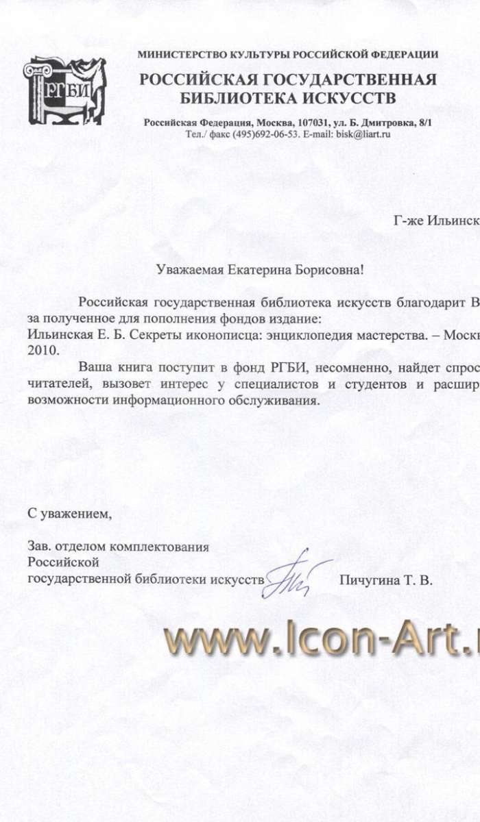 Уважаемая Екатерина Борисовна! Российская государственная библиотека искусств благодарит Вас за полученное для пополнения фондов издание: Ильинская Е.Б. Секреты иконописца: энциклопедия мастерства.- Москва, 2010. Ваша книга поступит в фонд РГБИ, несомненно, найдет спрос у читателей, вызовет интерес у специалистов и студентов и расширит возможности информационного обслуживания. С уважением, Зав. Отделом комплектования Российской государственной библиотеки искусств Пичугина Т.В. |
