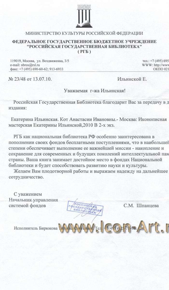 Уважаемая Екатерина Борисовна! Российская Государственная Библиотека благодарит Вас за передачу в дар издания: Ильинская Е. Секреты иконописца. М.2010. в 2-х экземплярах она хранится в основном фонде под № 10-37581. РГБ как национальная библиотека РФ особенно заинтересована в пополнении своих фондов бесплатными поступлениями, что в наибольшей степени обеспечивает выполнение ее важнейшей миссии-накопление и сохранение для современных и будущих поколений интеллектуальной памяти старины. Ваша книга займет достойное место в фондах Национальной библиотеки и будет способствовать развитию науки и культуры. Желаем Вам плодотворной работы и выражаем надежду на дальнейшее сотрудничество. С уважением, Начальник Управления Комплектования фондов С.М. Шпанцева. |