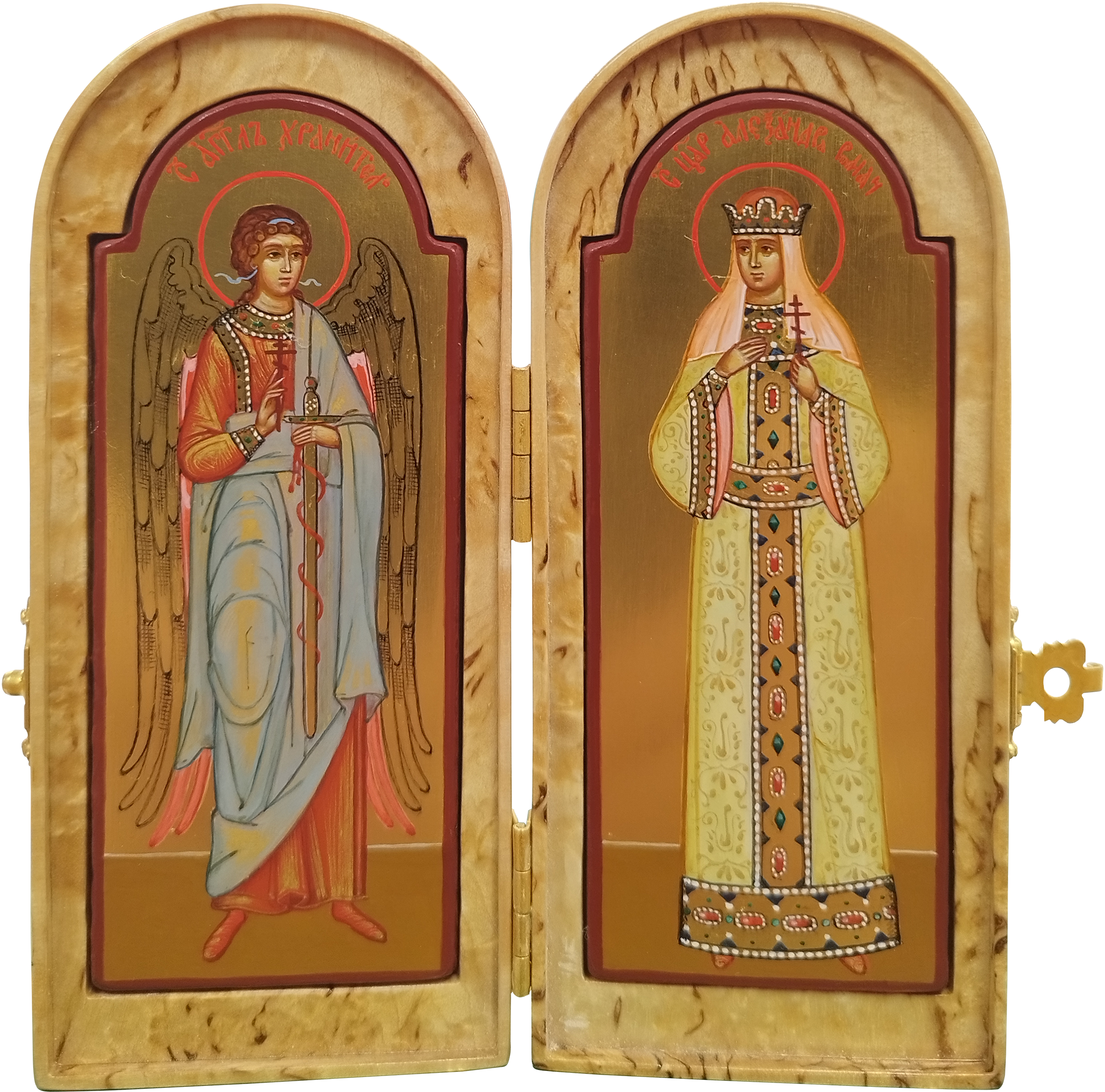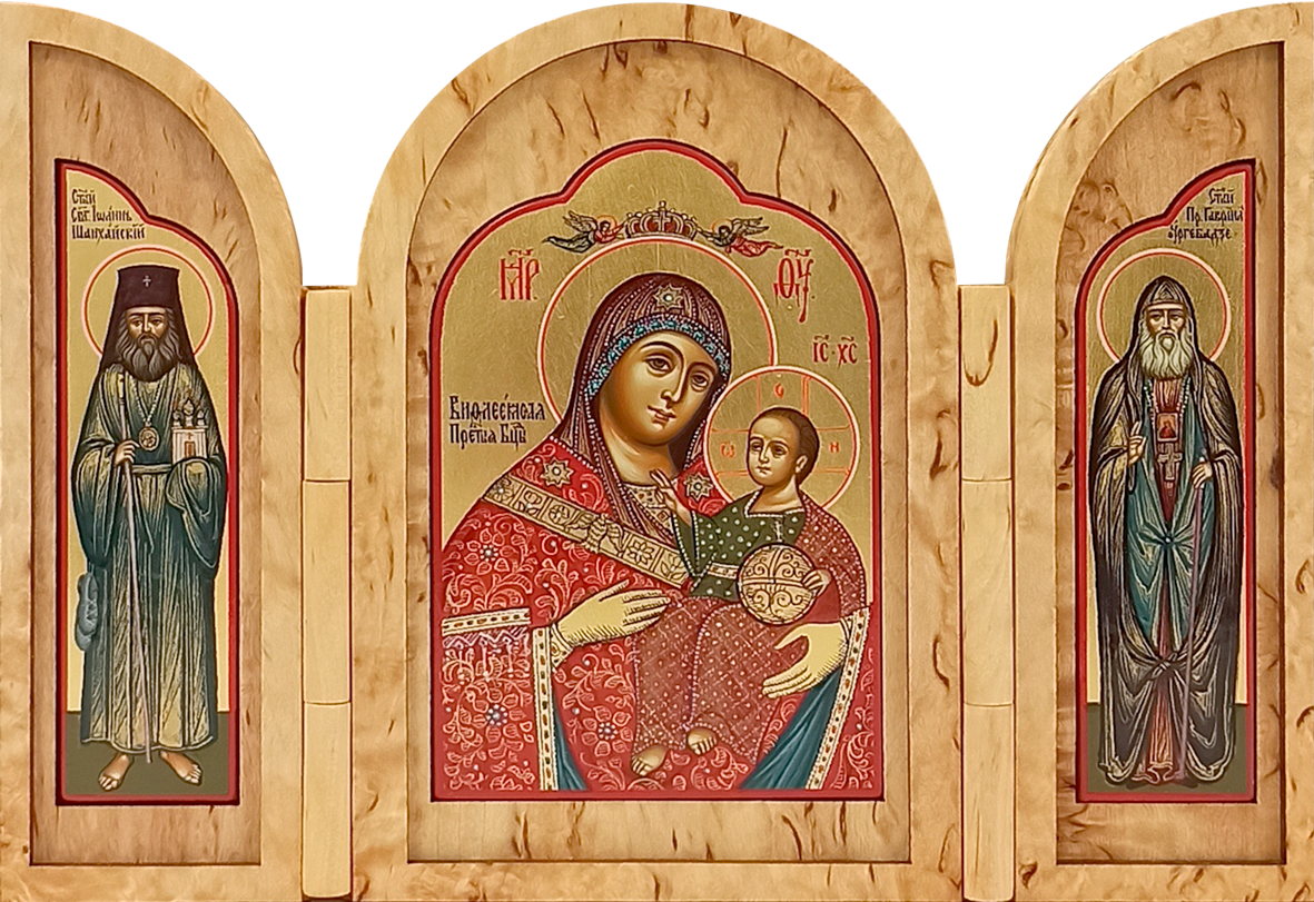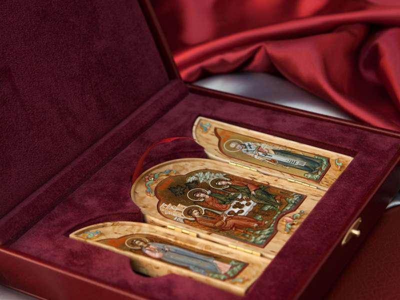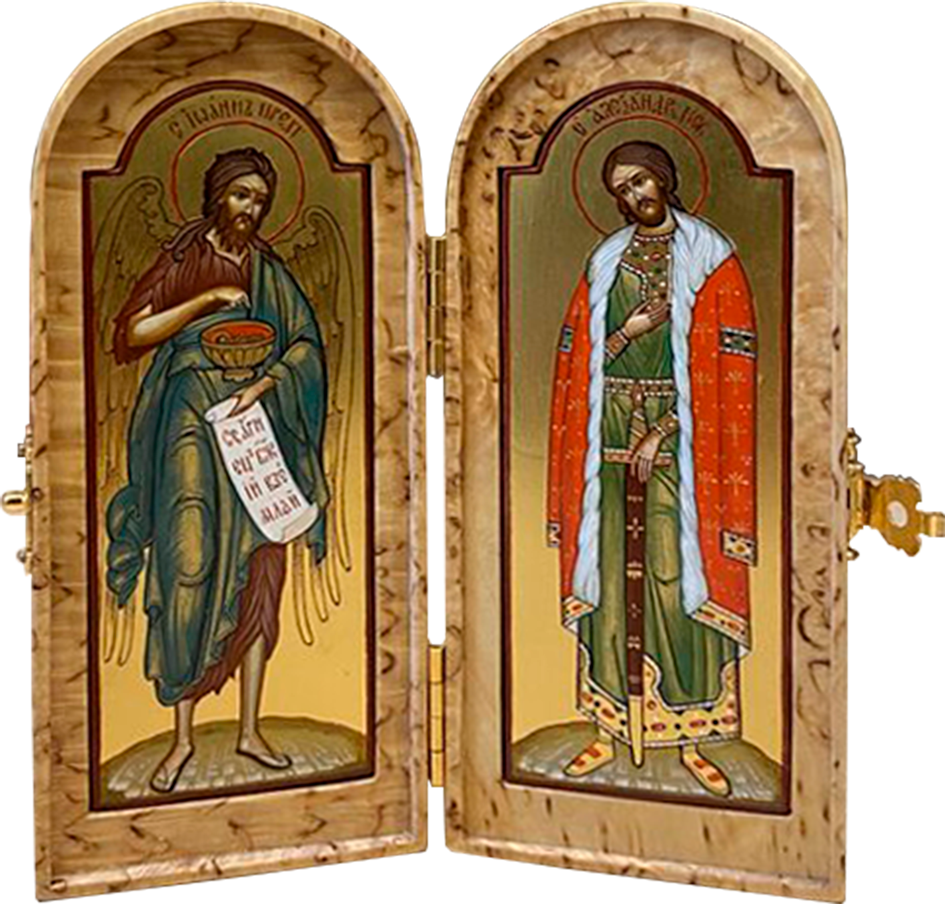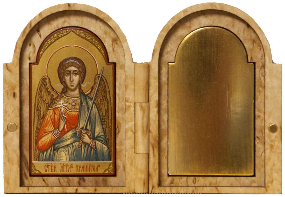 Во время войны войско всегда сопровождалось походной церковью, где также имелись небольшие походные складные иконостасы, а также каждый воин непременно имел у себя нагрудный маленький складень, с которым никогда не расставался. Наша иконописная мастерская предлагает Вам складни, выполненные из дорогой породы дерева – карельской березы. Из-за своего причудливого рисунка карельская береза с древности использовалась для создания и украшения художественных изделий.