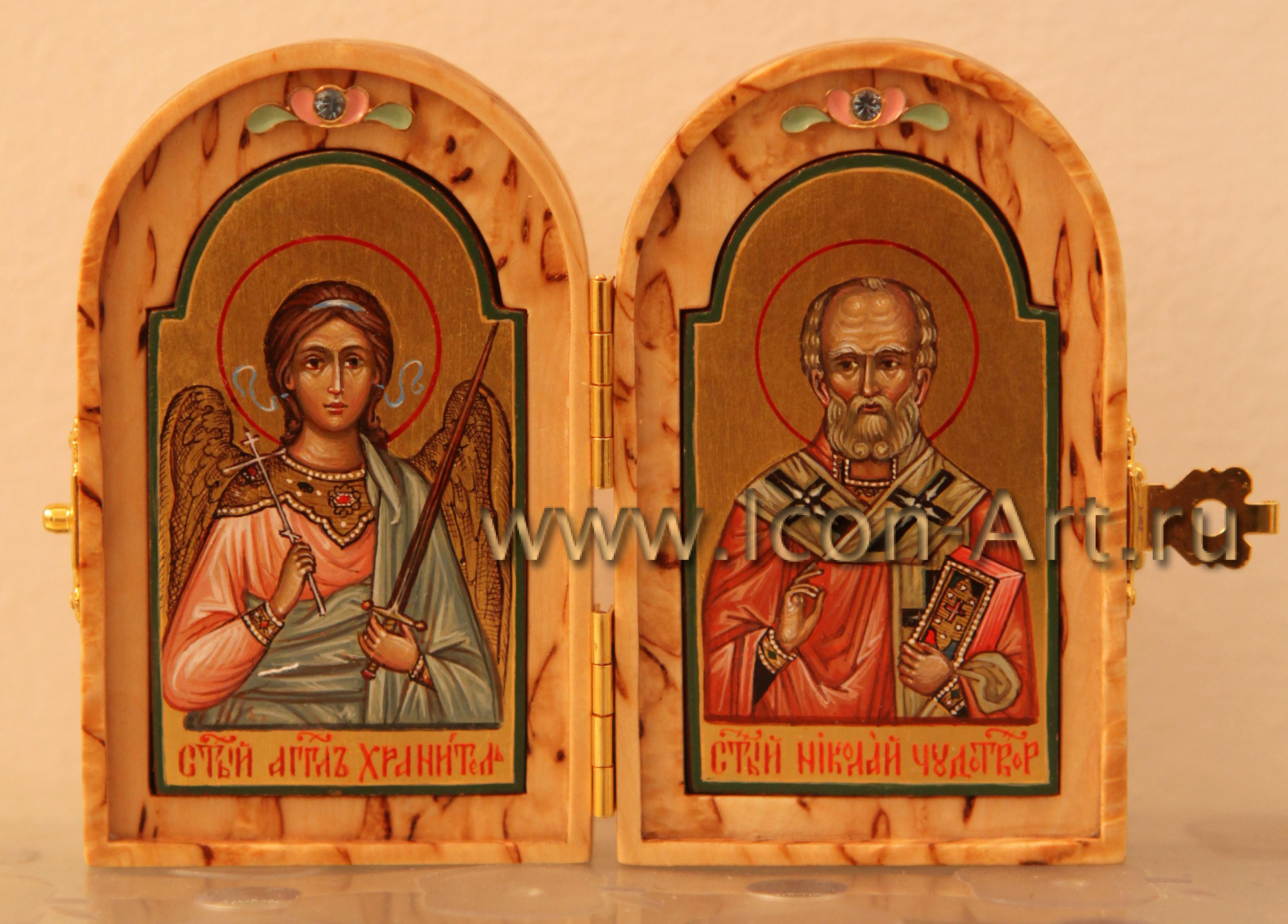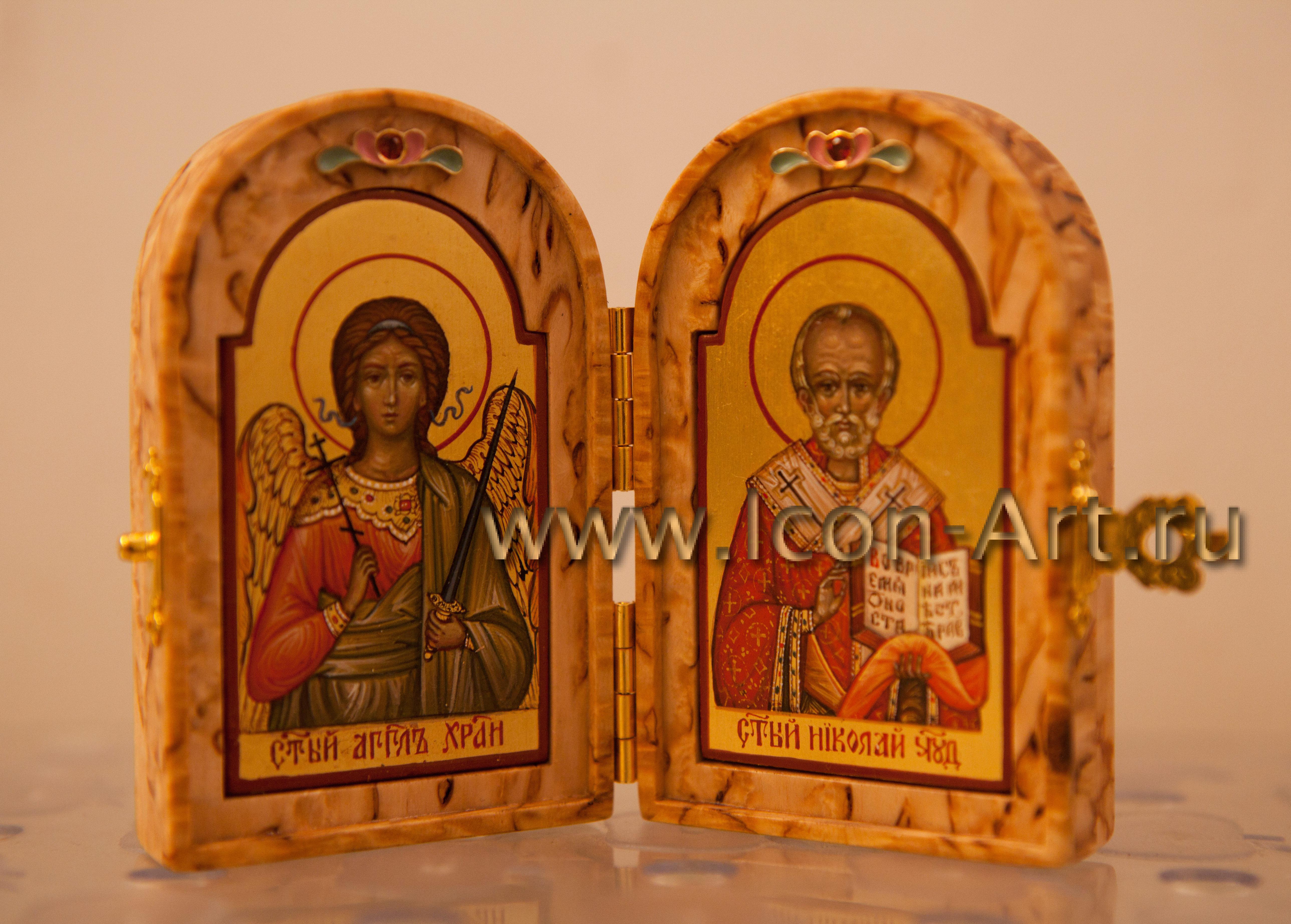 Иконы в складне написаны в технике миниатюры по золоту, а сам складень может быть украшен серебряной или золоченой сканью, а также цветной эмалью или драгоценными камнями. Из за малого размера такую икону всегда можно взять с собой, куда бы Вы не отправились. Она станет прекрасным и дорогим подарком близкому человеку. На двухстворчатой иконе-складне могут быть изображены особо почитаемые святые, например Ангел Хранитель и святой покровитель по имени, или святитель Николай Мирликийский (покровитель в путешествии). На складне-триптихе могут быть изображены двое святых, обращенные в молении к Богородице или Спасителю.