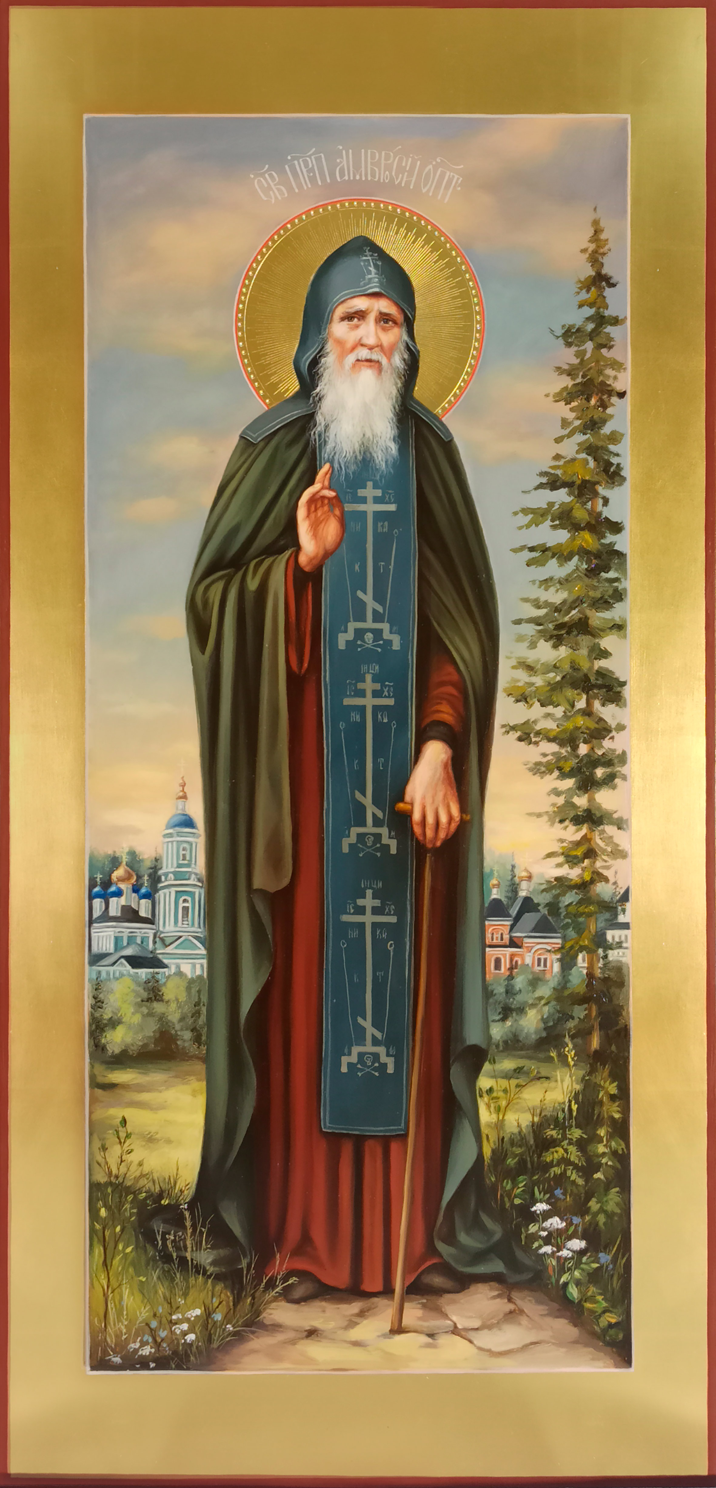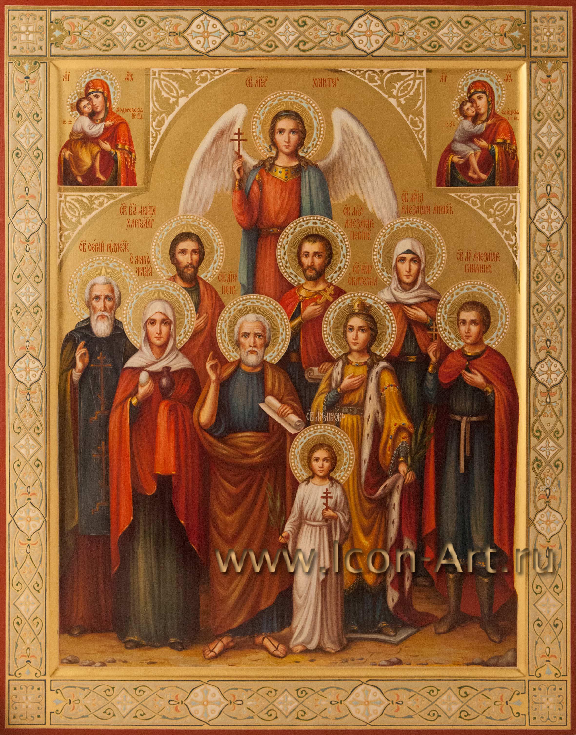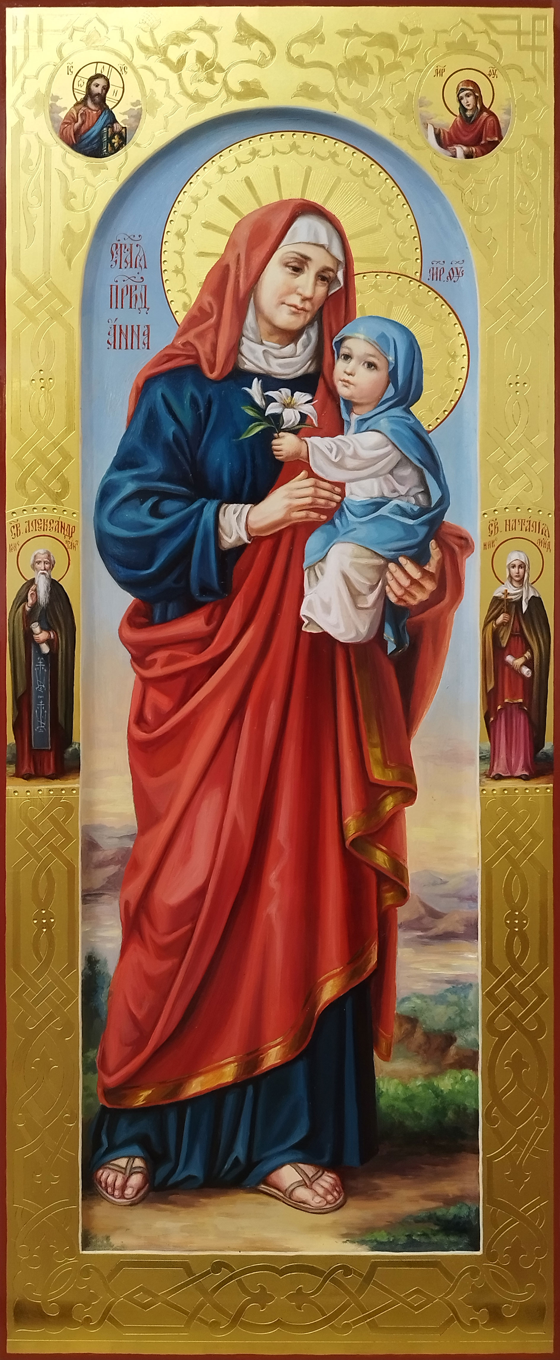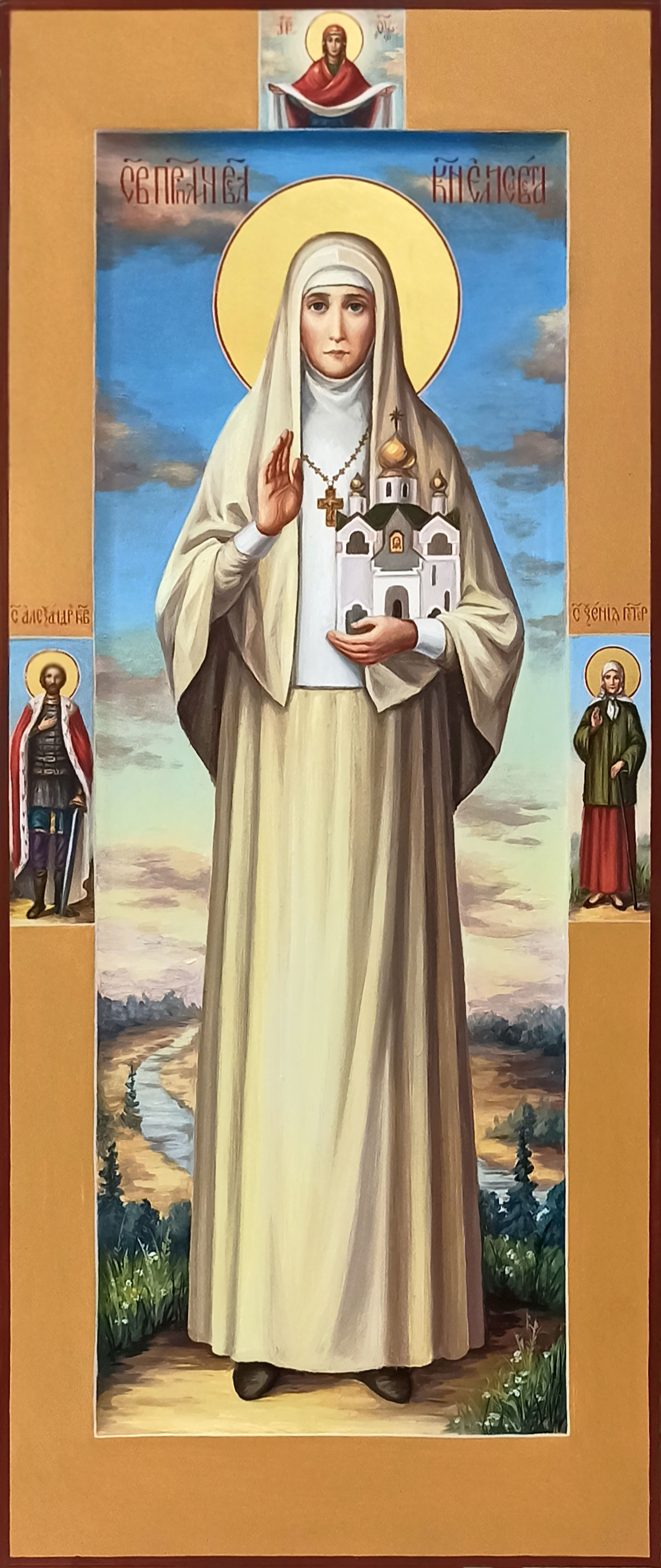 Наша мастерская является поклонником древнего иконописного стиля и техники, но жизнь заставила нас поменять мнение о более поздних иконах, где святые изображены масляными красками, реалистично, как в земной жизни. К нам в мастерскую пришла женщина и попросила написать мерную икону со святой Ксенией Петербургской для своей внучки. Маленькая Ксения родилась в день празднования святого Серафима Саровского. Поэтому женщина попросила вместе со святой Ксенией написать преподобного Серафима и икону Божией Матери Умиление, на которую молился старец. Когда Ксения родилась, о мерных иконах было мало публикаций и женщина не знала, что бывают такие иконы. Она пришла к нам когда девочке было уже шесть лет. Родители читали ей духовные книги и показывали иконы её святых покровителей. Это были детские книги, где святые изображены реалистично. Женщина попросила написать святых именно такими, как её внучка привыкла видеть в книгах. Словно святые мерной иконы сами пришли в дом.