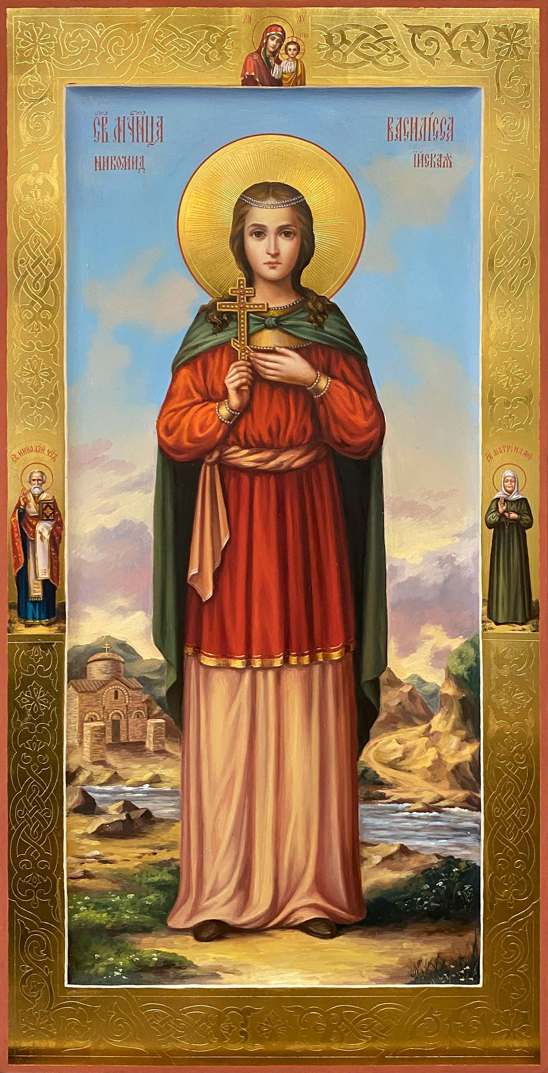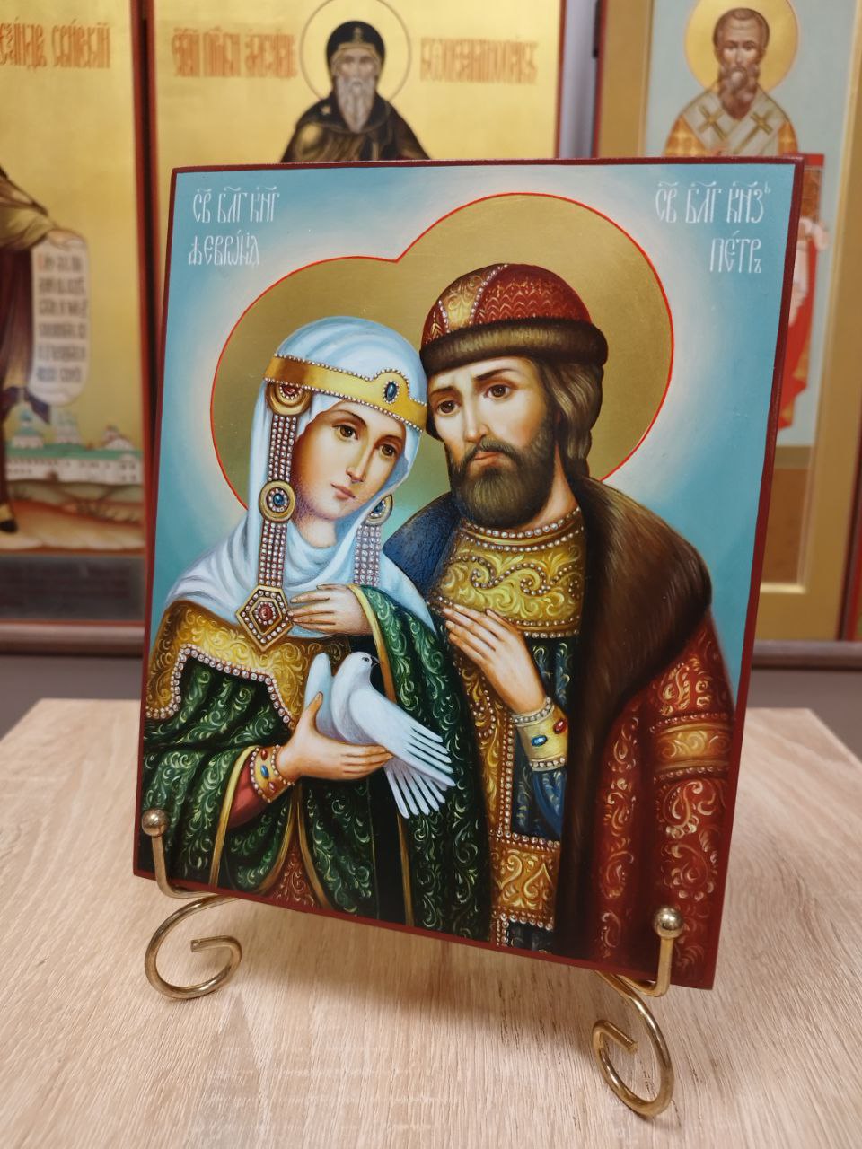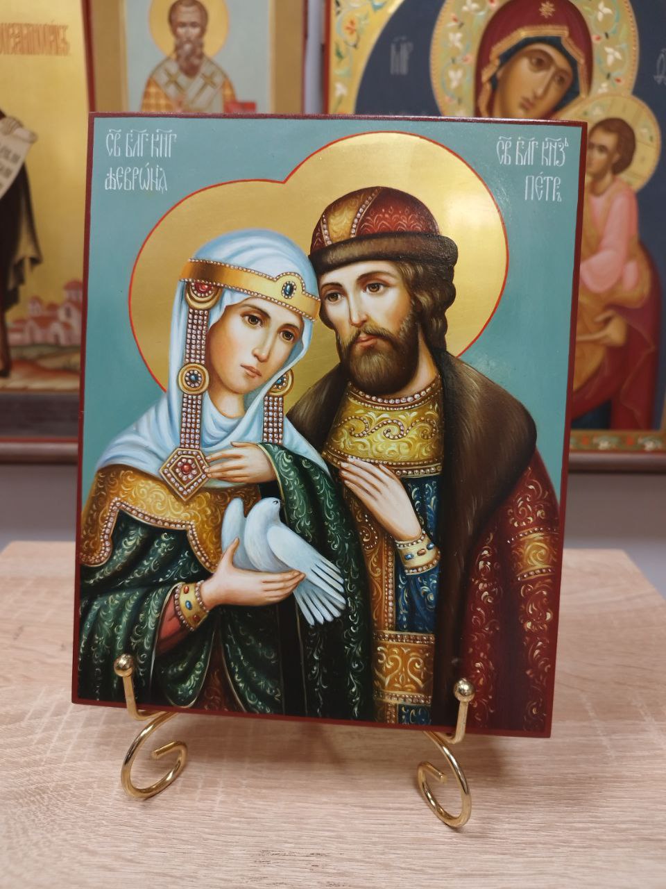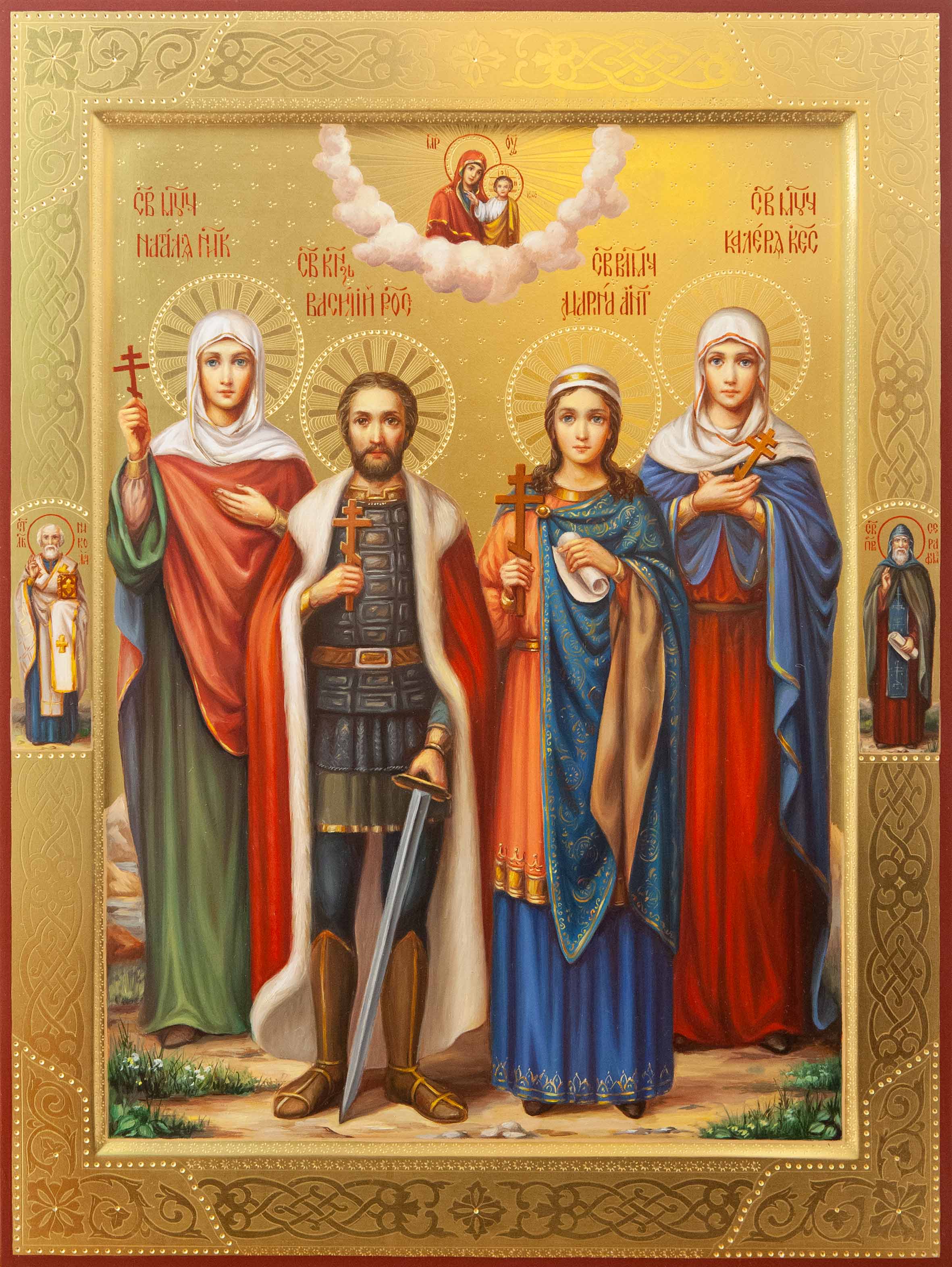 Наша мастерская является поклонником древнего иконописного стиля и техники, но жизнь заставила нас поменять мнение о более поздних иконах, где святые изображены масляными красками, реалистично, как в земной жизни. К нам в мастерскую пришла женщина и попросила написать мерную икону со святой Ксенией Петербургской для своей внучки. Маленькая Ксения родилась в день празднования святого Серафима Саровского. Поэтому женщина попросила вместе со святой Ксенией написать преподобного Серафима и икону Божией Матери Умиление, на которую молился старец. Когда Ксения родилась, о мерных иконах было мало публикаций и женщина не знала, что бывают такие иконы. Она пришла к нам когда девочке было уже шесть лет. Родители читали ей духовные книги и показывали иконы её святых покровителей. Это были детские книги, где святые изображены реалистично. Женщина попросила написать святых именно такими, как её внучка привыкла видеть в книгах. Словно святые мерной иконы сами пришли в дом.